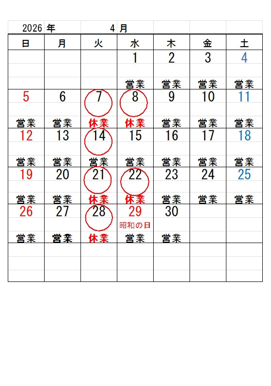 まことに勝手ながら、4月の営業日・休業日は下記の通りとなっております。