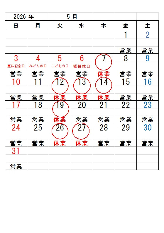 まことに勝手ながら、5月の営業日・休業日は下記の通りとなっております。